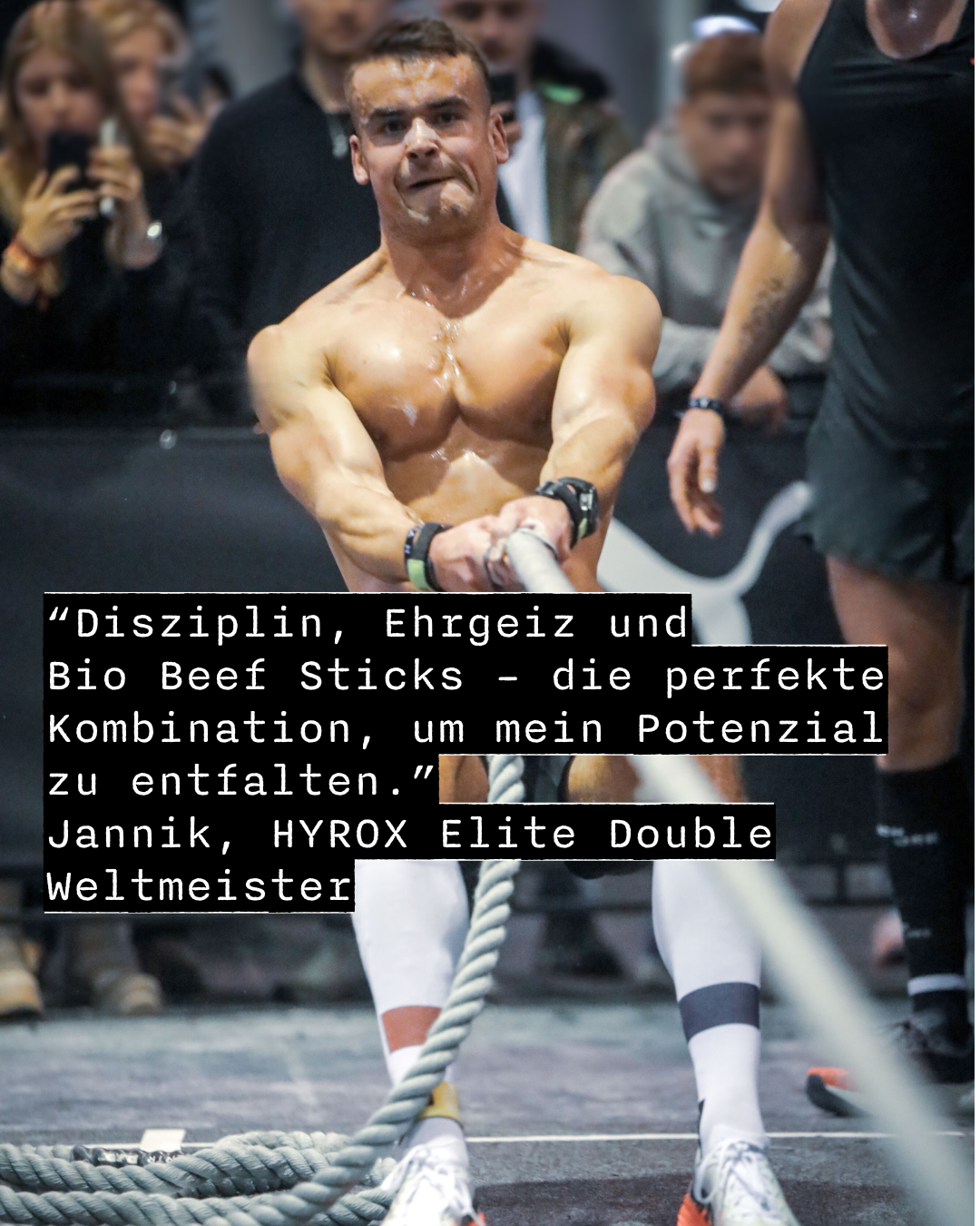 Mehr zu Jannik erfahrenJannik Czapla ist HYROX Elite Double Weltmeister 2025! Für Höchstleistungen setzt Jannik auf natürliche Snacks wie Bio Beef Sticks, die ihm den nötigen Energie-Boost liefern.