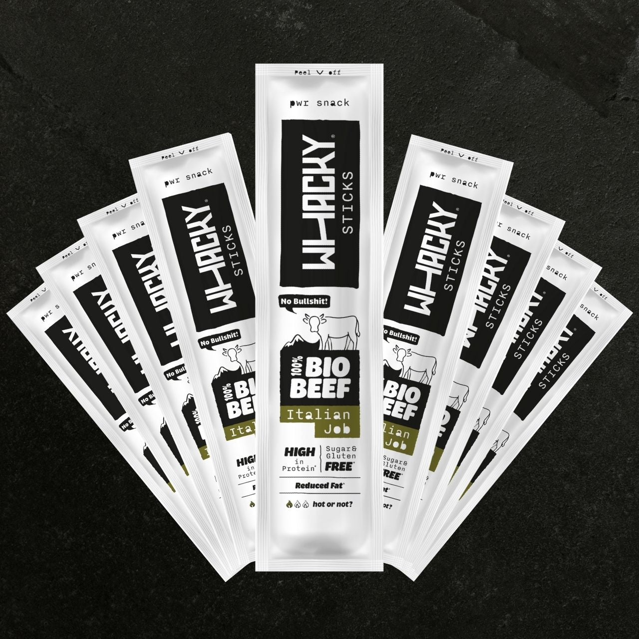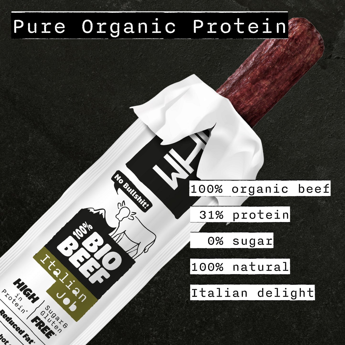 Jeder Beef-Stick versorgt dich mit 10g Bio-Protein. Lecker und ohne Bullshit. Unsere Bio Beef Sticks Italian Job begeistern mit italienischen Kräutern für echte mediterrane Vibes.