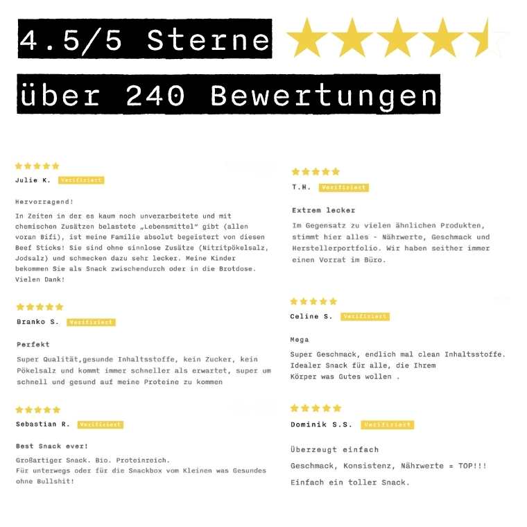 In times when there are hardly any unprocessed “foods” that are contaminated with chemical additives (especially Bifi), my family is absolutely delighted with these beef sticks! They have no pointless additives (nitrite curing salt, iodized salt) and taste delicious. My children have them as a snack between meals or in their lunch boxes. Thank you very much!